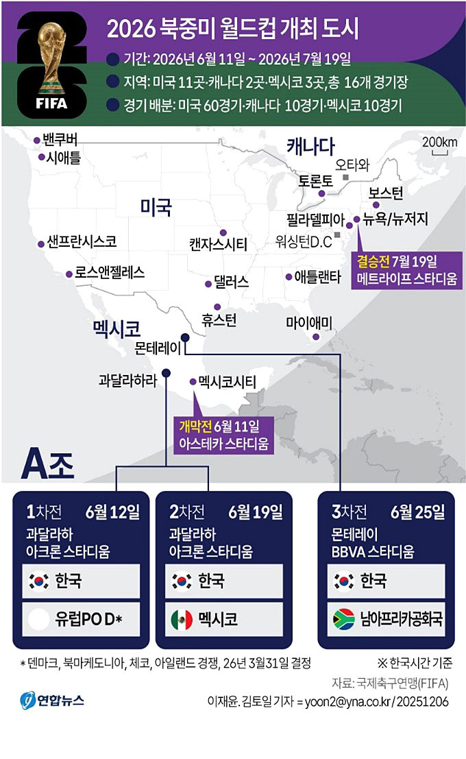 우리시간 내년 6월 12일 멕시코 과달라하라 아크론 스타디움에서 유럽 PO 패스D 승자와 1차전을 치르고, 19일 같은 곳에서 멕시코를 상대한다.