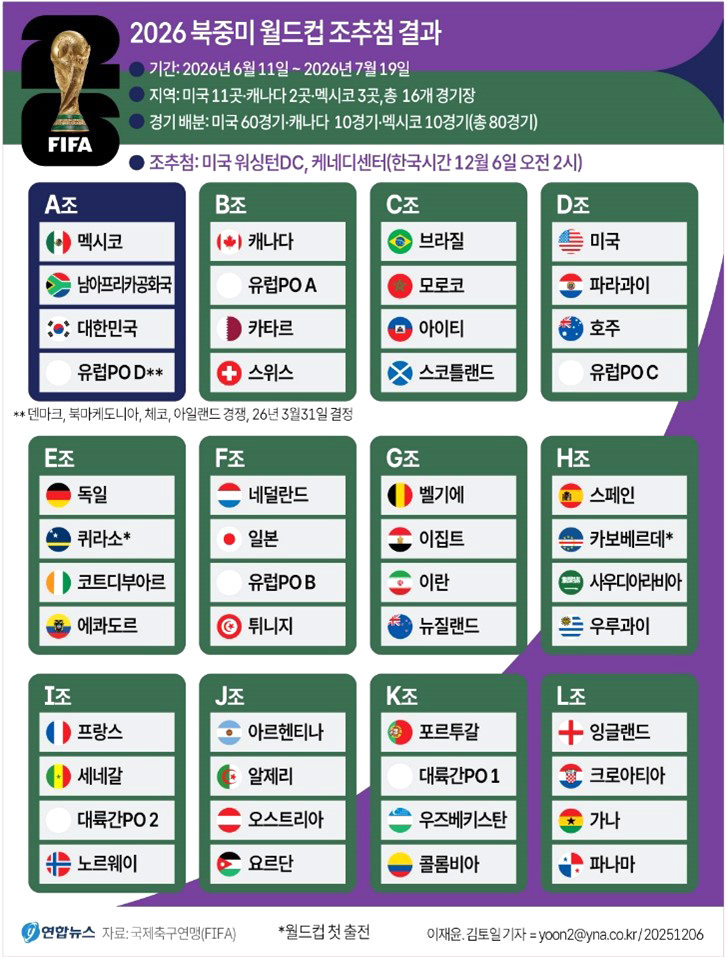 홍명보 감독이 지휘하는 한국 대표팀은 이번 조추첨에서 개최국 멕시코, 남아프리카공화국, 유럽 플레이오프(PO) 패스D 승자와 함께 A조에 배정됐다.